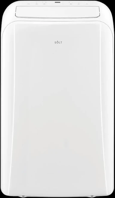 Sleek white portable air conditioner with front air vents, compact design, and wheels for easy movement. Ideal for cooling small rooms or offices. Energy efficient and easy to operate.