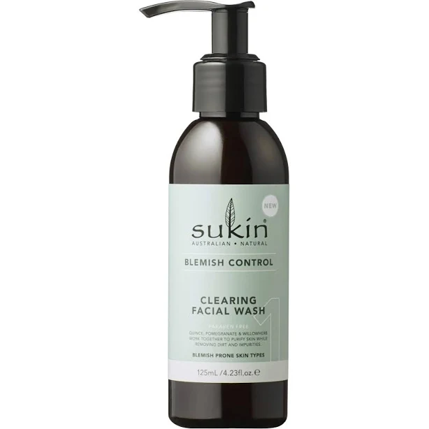 Experience a refreshing and effective approach to blemish control with Sukin's blemish control clearing facial wash. Crafted with a powerful blend of natural ingredients, this facial wash is designed to target and combat blemishes while maintaining your skin's delicate balance. Infused with willowherb, a botanical renowned for its calming properties and quince, known for its high vitamin C content, this gentle yet potent formula cleanses deeply to unclog pores and reduce the appearance of blemishes. The sulphate-free cleanser is enriched with eucalyptus and tea tree oil, providing antibacterial benefits to leave your skin feeling purified and revitalized. Incorporate this into your daily skincare routine for a clearer complexion, as it works harmoniously to promote a healthy, blemish-free glow.Features Natural antibacterial properties for blemish-fighting effectiveness. Mild yet effective exfoliants for a smoother, clearer complexion. Aids in reducing inflammation and promoting skin renewal. Calms irritated skin, leaving a soothing and refreshed feeling. Nourishes and protects, supporting overall skin health and vitality.