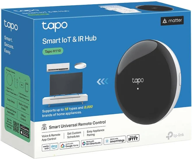The Tapo Smart Lock & IR Hub H110 controls all your infrared appliances with one remote to eliminate juggling multiple remotes. Supportover 8,000 brands across 18 device types, including older appliances, with a database updated every three months. Executehands-free voice commands via Siri, Alexa, or Google Assistant without needing your phone or remote. Operateyour devices anytime and anywhere via the app, such as turning off a forgotten air conditioner while out. Createcustom schedules for your appliances to fit your daily routine for further convenience. Automatecontrols based on GPS proximity to ensure a comfortable home as soon as you arrive. IntegrateIR appliances and Tapo sensors into the Matter ecosystem as a certified connection center. Performsmart actions seamlessly with other Tapo devices like sensors and cameras for a better smart life. Pairhome appliances easily by pressing a button on the remote and completing quick button tests in the app. Maintaincontrol via the Tapo app even offline, as long as your smartphone and hub are on the same LAN.